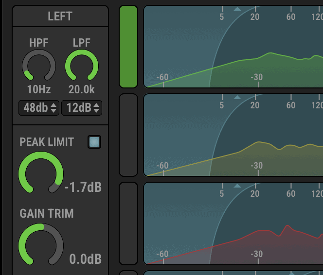 Redirect low frequencies from the mains to the LFE, or HF from the LFE back into the mains, using a carefully designed linkwitz-Riley filter set. You can even adjust the level of any redirected signals on a channel-by-channel basis.